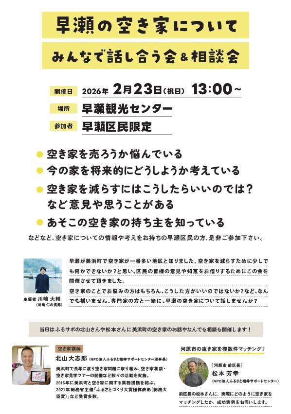 美浜町の早瀬地区にて空き家についてみんなで話し合う会が開催されます。
